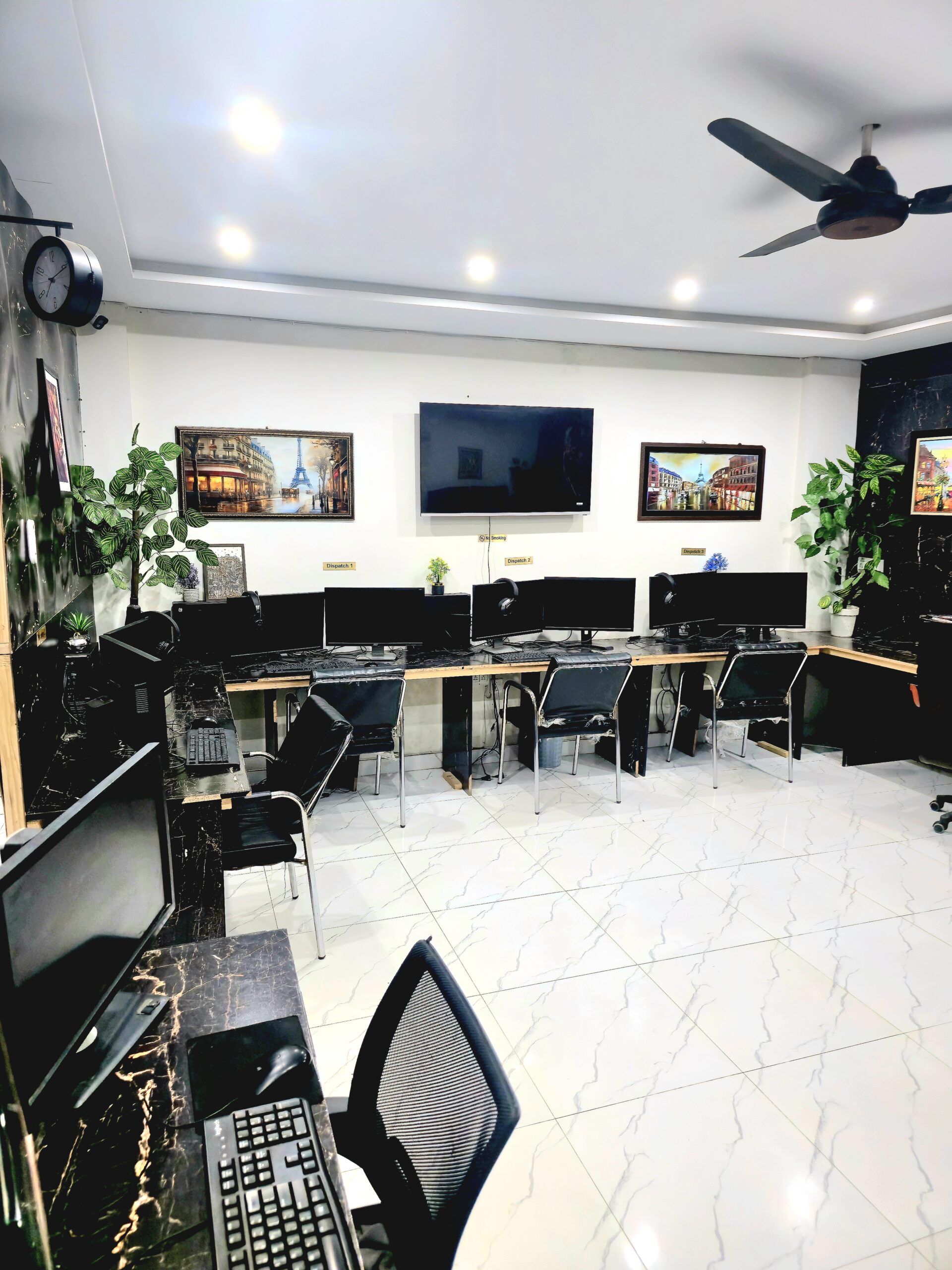 Main dispatch floor with dual-monitor workstations โ€” Saztech Solutions Lahore operations centre